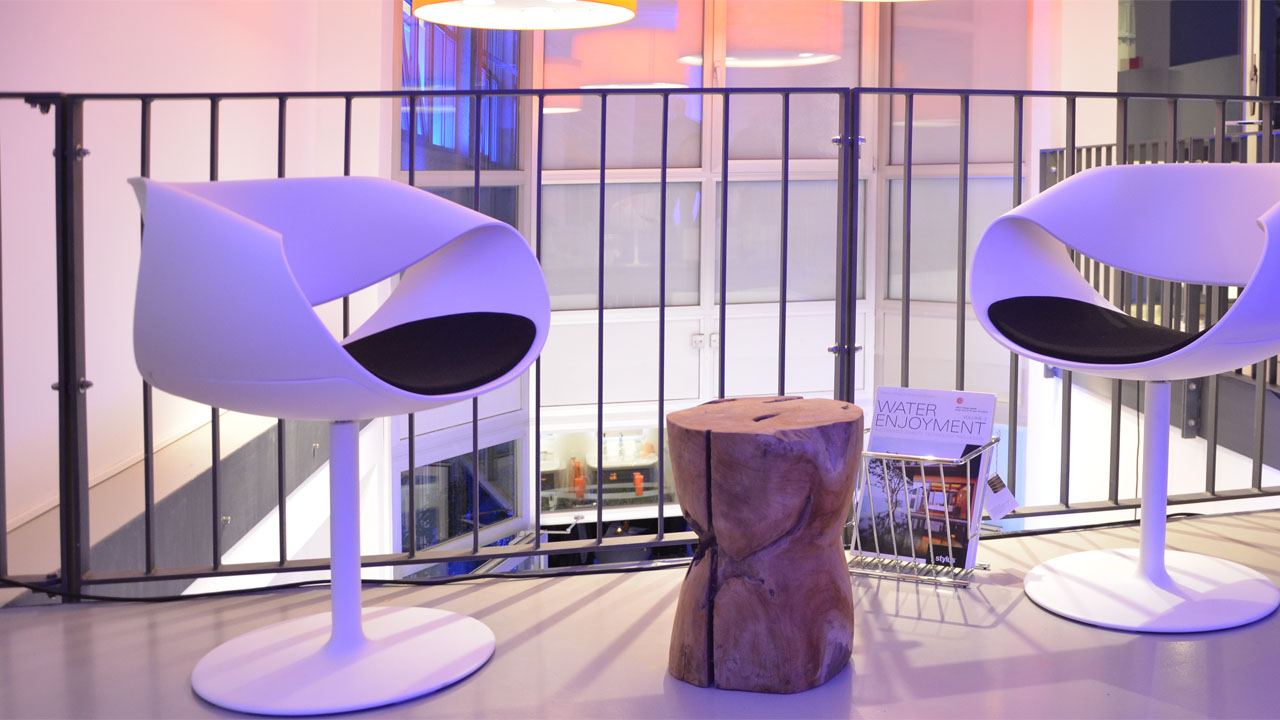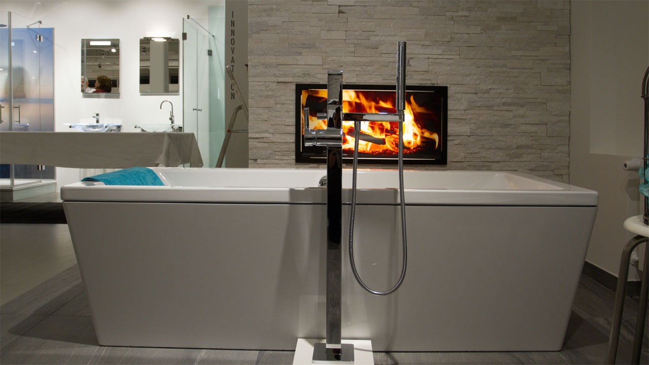 Ein Rundgang entlang der Fensterfront lässt den Kunden in aneinander gereihten Kabinen verschiedene Badsituationen entdecken: